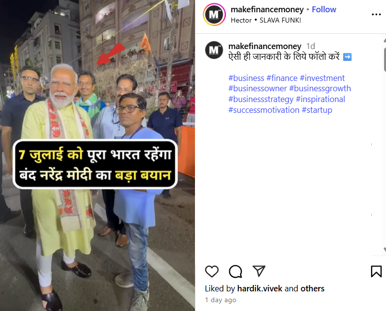 इंस्टाग्राम यूजर makefinancemoney ने 2 जुलाई को पोस्ट (आर्काइव लिंक) शेयर की है। इसमें लिखा है, “7 जुलाई को पूरा भारत रहेगा बंद नरेंद्र मोदी का बड़ा बयान।